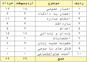 تهیه و تنظیم: نغمه ظریفی مقدم، حدیث خوبرفتار، الینا کرم بگی، محمد گلستان جو آگاهی بیشتر: این گزارشات آماری از میان بیش از ۶۹ خبر که در طول اردیبهشت ماه ۱۴۰۴ تهیه شده است. این گزارشات از سایت کمیته دفاع از حقوق زنان تهیه شده است که از رسانههای داخلی و خارجی مانند هه نگاو، هرانا، ایرنا، ایران وایر، …