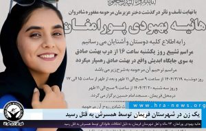 به گزارش خبرگزاری هرانا، ارگان خبری مجموعه فعالان حقوق بشر در ایران، یک زن در شهرستان فریمان توسط همسرش به قتل رسید. هویت وی، هانیه بهبودی پورامغان، ۲۴ ساله، مادر یک دختر چهارساله، دانشجوی تربیت بدنی و ساکن شهرستان فریمان توسط هرانا احراز شده است.