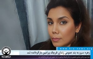 خبرگزاری هرانا – زهره سرو، زندانی سیاسی محبوس در زندان قرچک ورامین، به بند عمومی این زندان بازگردانده شد. وی اخیرا به صورت تنبیهی به سلول انفرادی منتقل شده بود.