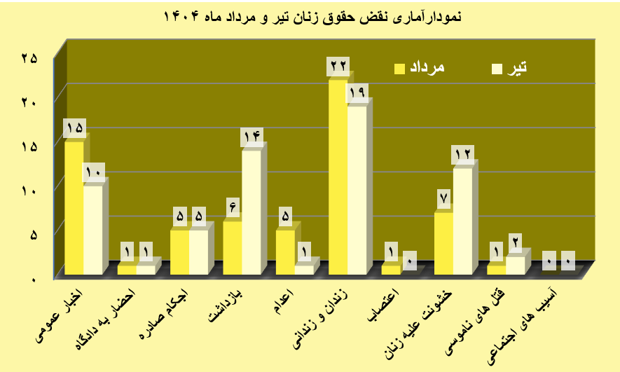 اخبار و گزارشهای مربوط به نقض حقوق زنان در مرداد ماه ۱۴۰۴ که توسط اعضای کمیته دفاع از حقوق زنان گردآوری شده است .جهت اطلاعات بیشتر در لینک زیر قابل مشاهده است: